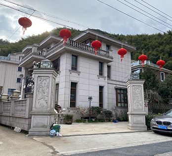 釉面輕瓷保溫板白麻色系造建別墅外墻,防石材效果99%,最直觀效果,院子外石柱用的是天然石材,石柱已積灰變黑,外墻板依舊潔白像新的一樣,自潔性能強(qiáng)大。