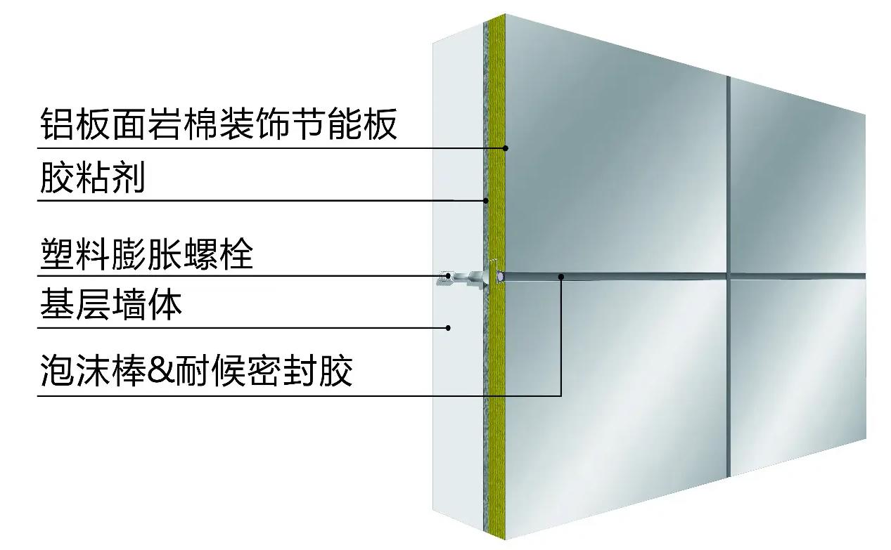 鋁板保溫一體板主要工序是粘接+錨固,施工簡(jiǎn)單、快速,周期短、交付快。