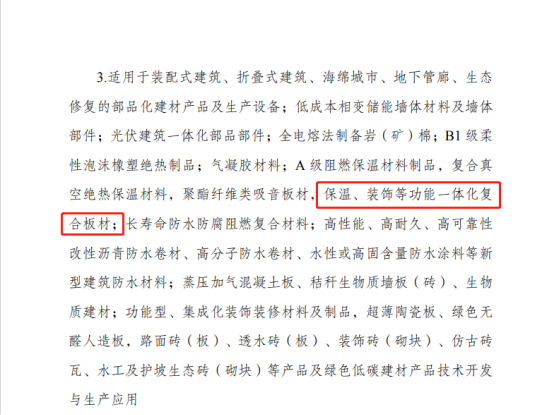 適用于裝配式建筑、折疊式建筑、海綿城市、地下管廊、生態(tài)修復的部品化建材產品及生產設備;低成本相變儲能墻體材料及墻體部件;光伏建筑一體化部品部件;全電熔法制備巖(礦)棉;B1 級柔性泡沫橡塑絕熱制品;氣凝膠材料;A 級阻燃保溫材料制品,復合真空絕熱保溫材料,聚酯纖維類吸音板材,保溫、裝飾等功能一體化復合板材;長壽命防水防腐阻燃復合材料;高性能、高耐久、高可靠性改性瀝青防水卷材、高分子防水卷材、水性或高固含量防水涂料等新型建筑防水材料;蒸壓加氣混凝土板、秸稈生物質墻板(磚)、生物質建材;功能型、集成化裝飾裝修材料及制品,超薄陶瓷板、綠色無醛人造板,路面磚(板)、透水磚(板)、裝飾磚(砌塊)、仿古磚瓦、水工及護坡生態(tài)磚(砌塊)等產品及綠色低碳建材產品技術開發(fā)與生產應用。