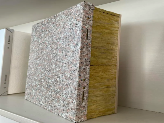 石材保溫一體板是以超薄的天然石材與保溫材料用膠水進行復合而成,相比于天然石材,石材保溫一體板的價格更低,許多人也用它來替代干掛石材,但石材畢竟很重,膠水復合安全風險較大。