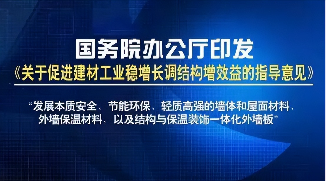 國務院辦公廳印發(fā)《關于促進建材工業(yè)穩(wěn)增長調(diào)結(jié)構增效益的指導意見》中,明確指出“發(fā)展本質(zhì)安全、節(jié)能環(huán)保、輕質(zhì)高強的墻體和屋面材料、 外墻保溫材料,以及結(jié)構與保溫裝飾一體化外墻板”。