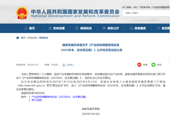 2023年七月十四日國家發(fā)改委在官網(wǎng)發(fā)布了關于《產業(yè)結構調整指導目錄(2023年本,征求意見稿)》(簡稱《目錄》)公開征求意見的公告。