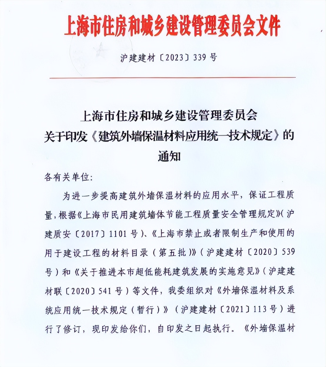 上海市發(fā)布《建筑外墻保溫材料應用統(tǒng)一技術規(guī)定》,對保溫裝飾板外保溫系統(tǒng)用保溫材料的性能要求具體規(guī)范。