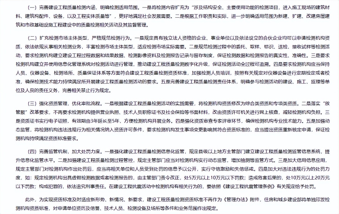 《建設(shè)工程質(zhì)量檢測管理辦法》加大處罰力度。對一些質(zhì)量不合格、產(chǎn)品不合規(guī)的企業(yè)處罰力度加大,產(chǎn)品檢測報告必須真實(shí)、有效、合規(guī)。