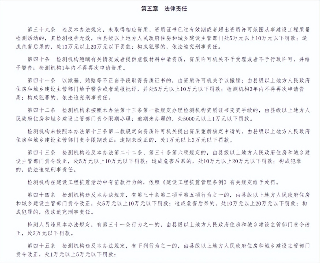 規(guī)定:規(guī)定檢測機(jī)構(gòu)出具虛假檢測數(shù)據(jù)或者檢測報告的,由主管部門責(zé)令改正,處5萬元以上10萬元以下罰款;造成危害后果的,處10萬元以上20萬元以下罰款;構(gòu)成犯罪的,依法追究刑事責(zé)任。在建設(shè)工程抗震活動中檢測機(jī)構(gòu)有相關(guān)行為的,要依照《建設(shè)工程抗震管理?xiàng)l例》有關(guān)規(guī)定給予處罰。